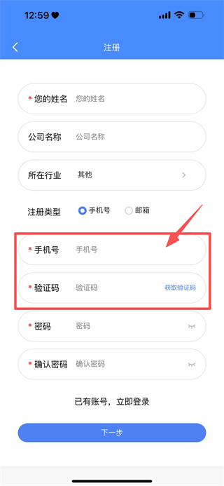 3、選擇注冊類型為手機號,輸入號碼后點擊獲取驗證碼并輸入驗證碼。