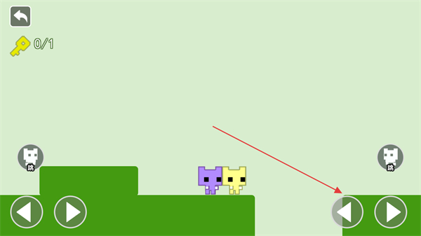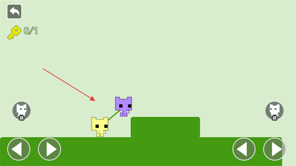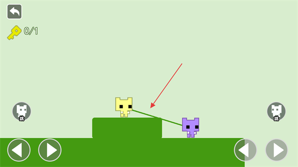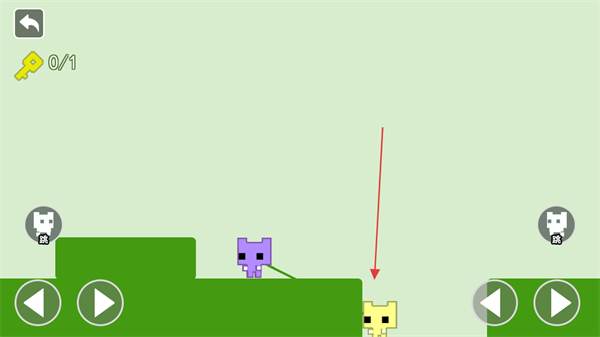 2、當(dāng)遇到高低差地形時(shí),控制其中一個(gè)角色移動(dòng),帶動(dòng)另一個(gè)角色越過障礙,如讓黃色角色先下臺(tái)階,紫色角色隨之移動(dòng)。