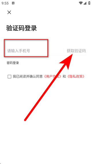 3、在驗證碼登錄頁面,輸入手機(jī)號,點擊獲取驗證碼。