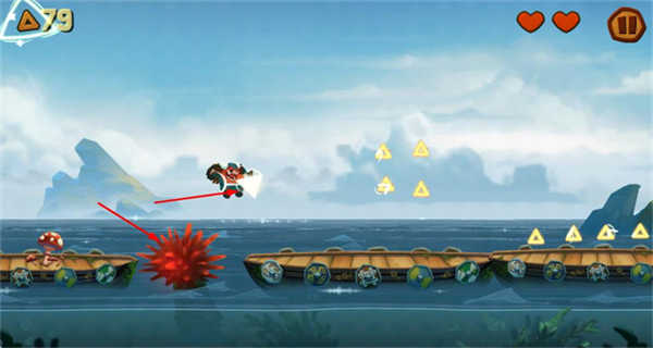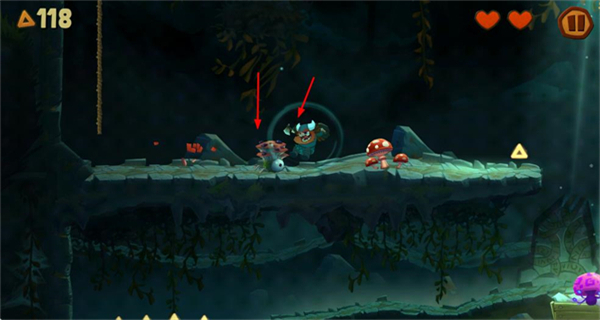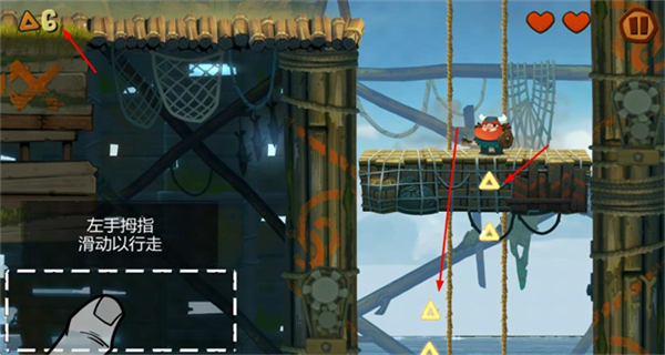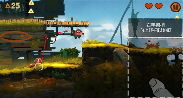 2、右手滑動使角色跳躍,跨越場景障礙,同時與場景元素互動,推進關(guān)卡發(fā)展。