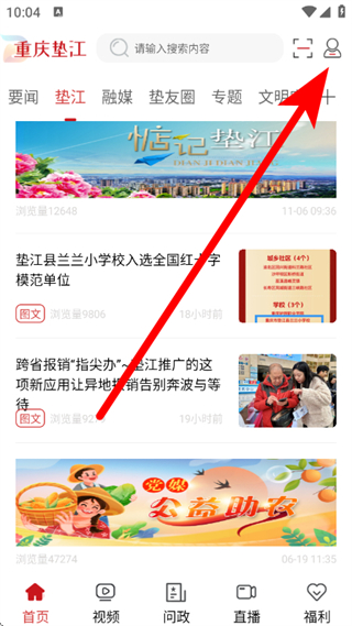 1、打開(kāi)重慶墊江,點(diǎn)擊右上角的個(gè)人圖標(biāo),進(jìn)入個(gè)人頁(yè)面。