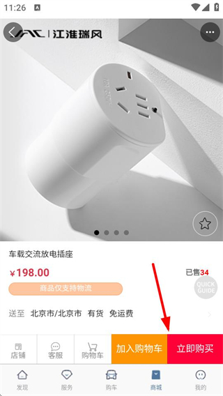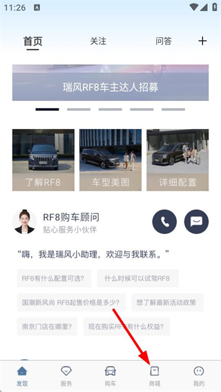 1、在江淮瑞風(fēng)首頁,點(diǎn)擊底部商城選項(xiàng),進(jìn)入商城頁面。