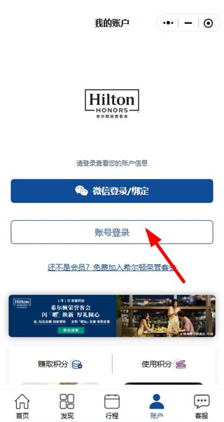 1、在希爾頓榮譽客會首頁,點擊底部賬戶選項,進入我的賬戶頁面。