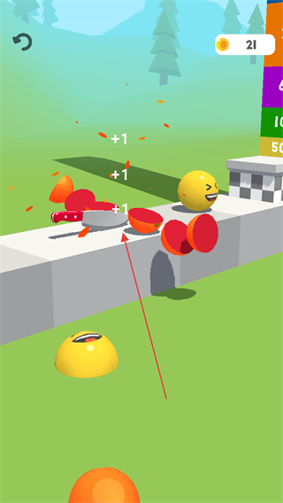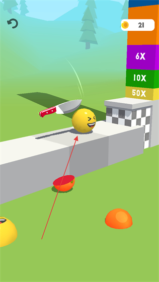 3、在賽道上靈活操控刀具,切割黃色笑臉球等目標(biāo),向終點(diǎn)前進(jìn)。