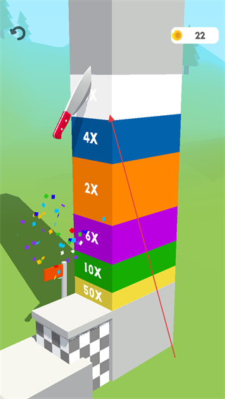 4、到達(dá)終點(diǎn)后,切割帶有倍數(shù)標(biāo)識的方塊柱,獲取高額積分和金幣獎(jiǎng)勵(lì)。