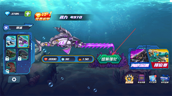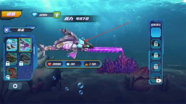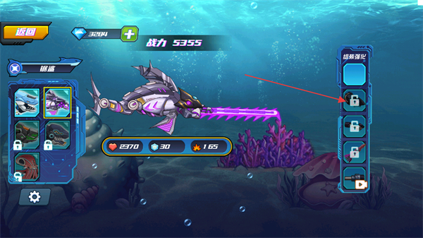 1、在游戲主頁(yè)上,我們可以點(diǎn)擊組裝強(qiáng)化,給機(jī)械鯊魚進(jìn)行裝備改造提升戰(zhàn)力。