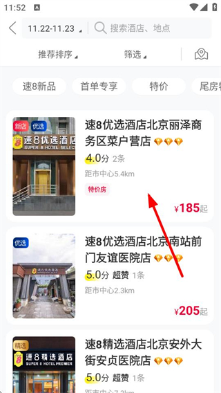 1、在速8酒店首頁(yè),選擇信息后,點(diǎn)擊搜索酒店,進(jìn)入酒店列表頁(yè)面。