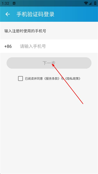2、在手機(jī)驗(yàn)證碼登錄界面,輸入手機(jī)號,勾選已閱讀并同意后點(diǎn)擊下一步。