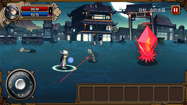 1、通過左下角的虛擬搖桿操控角色移動,在場景中探索,接近血的水晶目標。