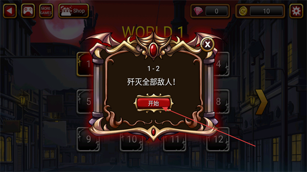 1、選擇關(guān)卡1-2,目標(biāo)為殲滅全部敵人,點(diǎn)擊開始進(jìn)入戰(zhàn)斗。