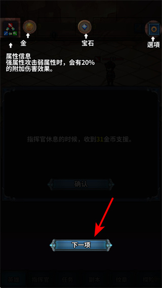 1、游戲中點擊下一項可查看新的游戲信息,屬性說明和資源獲取方式,后續(xù)戰(zhàn)斗和發(fā)展做好策略規(guī)劃。