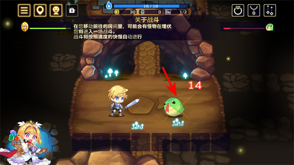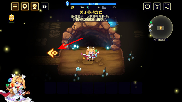 1、通過按方向按鍵或滑動屏幕來移動角色,按左箭頭按鍵能讓角色向左移動,以此探索不同區(qū)域,開始冒險進程。
