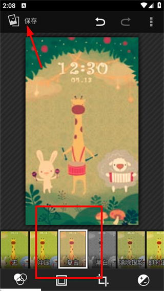 4、在編輯頁(yè)面,選擇濾鏡后,點(diǎn)擊左上角的保存,即可完成圖片編輯并保存。