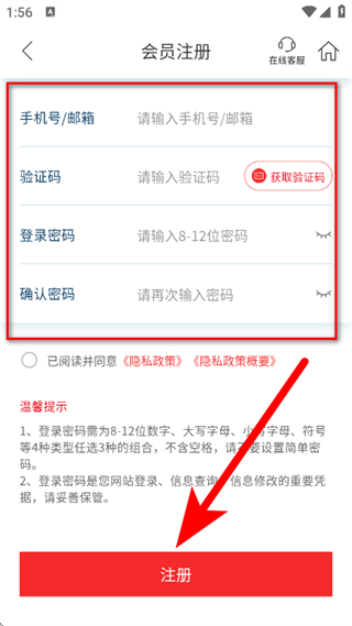 4、輸入手機(jī)號(hào)郵箱、驗(yàn)證碼、登錄密碼、確認(rèn)密碼,勾選已閱讀并同意后,點(diǎn)擊注冊(cè),完成操作。