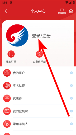 1、打開河北航空,在首頁(yè)點(diǎn)擊個(gè)人中心,進(jìn)入個(gè)人中心頁(yè)面。