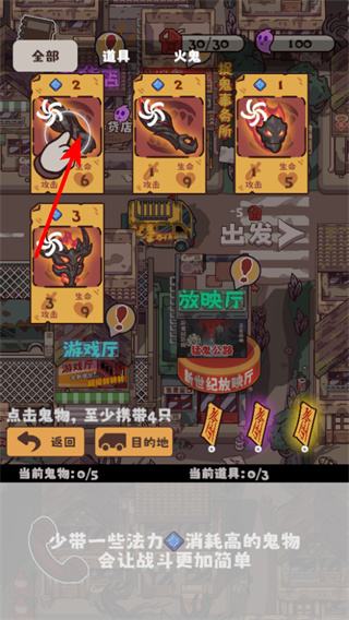 1、在鬼物選擇界面,點(diǎn)擊卡牌將其編入隊(duì)伍,至少攜帶4只鬼物才能出發(fā),是冒險(xiǎn)基礎(chǔ)準(zhǔn)備。