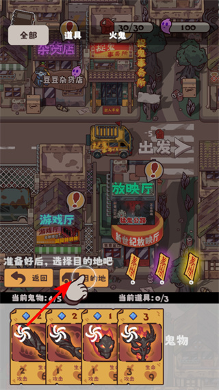 2、準(zhǔn)備好鬼物后,點(diǎn)擊目的地按鈕,可進(jìn)入地圖選擇界面,這是開(kāi)啟冒險(xiǎn)旅程的關(guān)鍵操作。