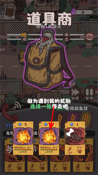 4、遇到道具商時(shí),可選擇一張道具卡牌帶走,這些道具能在戰(zhàn)斗中提供幫助,提升戰(zhàn)斗勝率。
