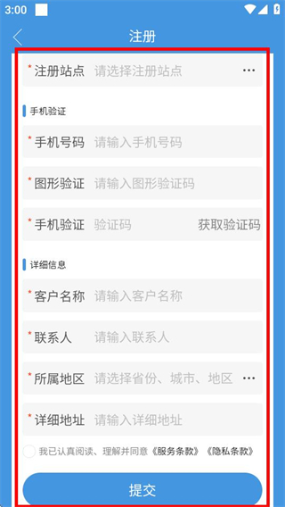 4、在注冊頁面,填寫信息并勾選協(xié)議后,點(diǎn)擊提交,即可完成注冊。