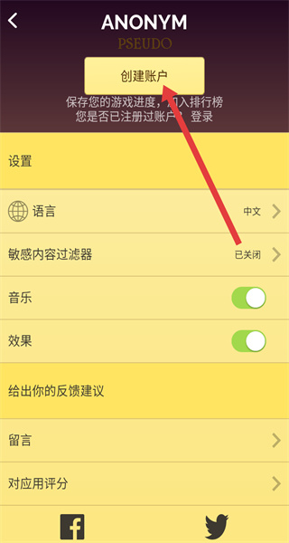 2、在游戲設(shè)置界面,點(diǎn)擊創(chuàng)建賬戶按鈕,進(jìn)入注冊界面。