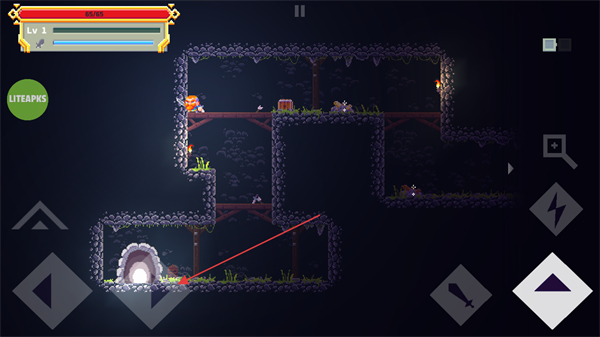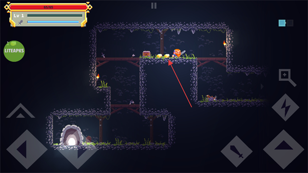 1、通過左下角的方向鍵操控矮人角色在洞穴場(chǎng)景中移動(dòng),探索不同區(qū)域,尋找寶箱和資源。