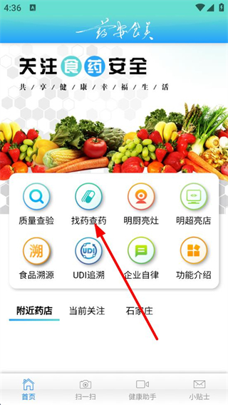 1、在APP首頁,點擊找藥查藥功能按鈕,進入找藥品頁面。