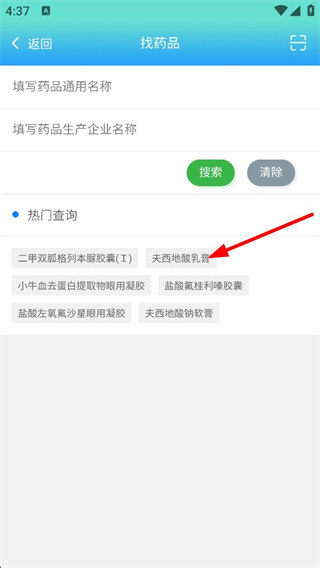 2、在找藥品頁面,可選擇熱門查詢中的藥品,或填寫藥品通用名稱。