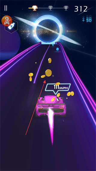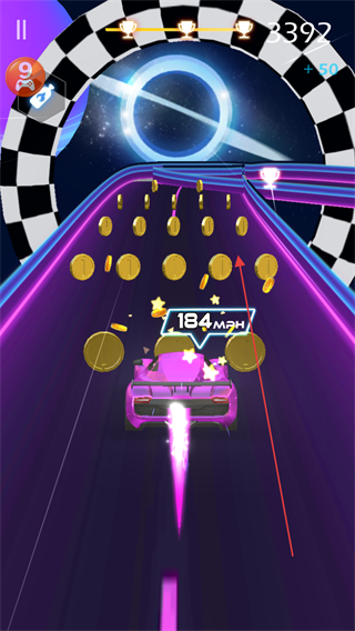 1、在充滿霓虹特效的賽道上駕駛賽車(chē),通過(guò)左右移動(dòng)賽車(chē)來(lái)躲避障礙物、收集金幣和藍(lán)色寶石等資源。