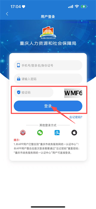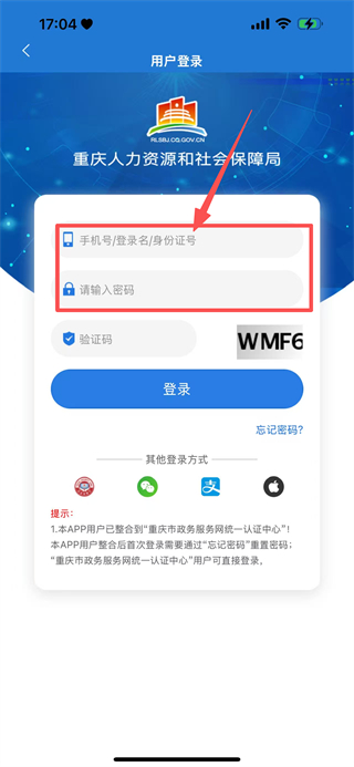 2、在用戶登錄界面,輸入手機(jī)號/登錄名/身份證號和密碼。