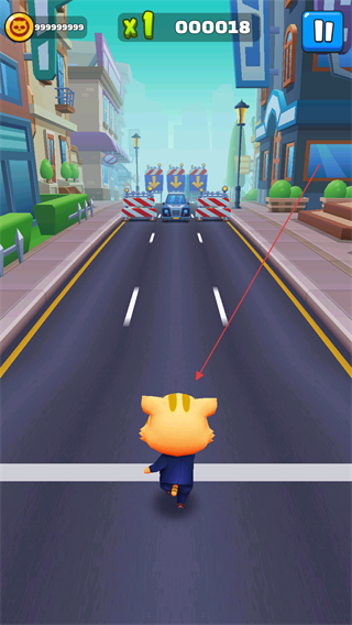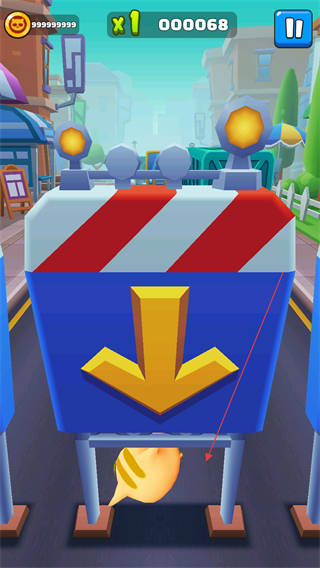 2、看到帶有向下箭頭的路障,向下滑動讓小貓翻滾穿過,避免碰撞。