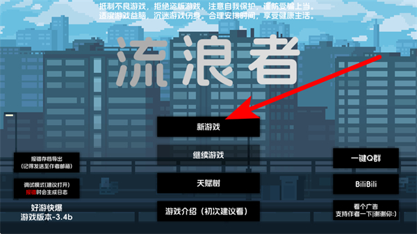 1、進(jìn)入游戲界面后,點擊新游戲開啟流浪者的生存冒險,這是進(jìn)入游戲的關(guān)鍵操作,準(zhǔn)確點擊可解鎖場景交互、資源拾取等玩法環(huán)節(jié)。