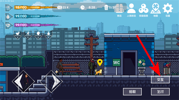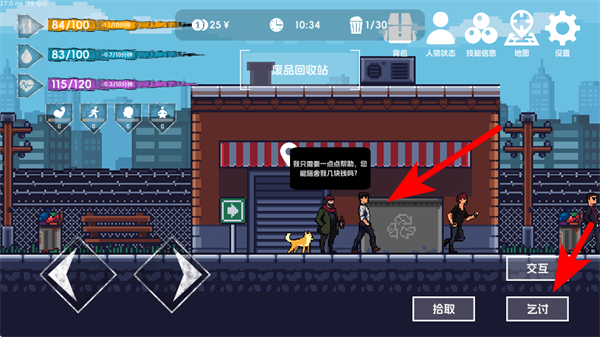 4、在遇到NPC或可乞討的場景時,點擊乞討按鈕獲取金錢或物資,補充生存資源,助力在城市中持續(xù)生存,提升流浪者的生存狀態(tài)。