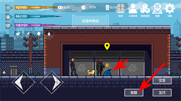 2、在游戲場景中,點擊交互按鈕與場景元素如垃圾桶、NPC互動,獲取生存線索或資源,這是探索場景、積累生存資本的重要方式。