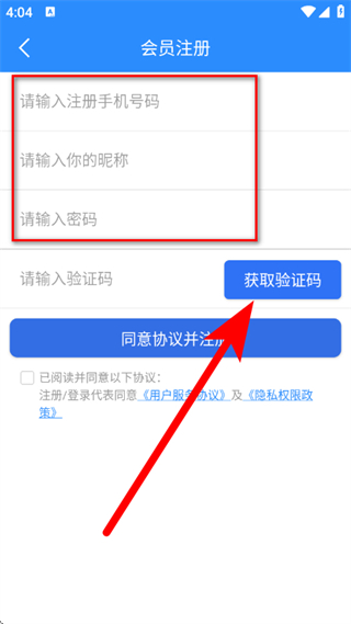 4、輸入注冊(cè)手機(jī)號(hào)碼、昵稱、密碼后,點(diǎn)擊獲取驗(yàn)證碼。