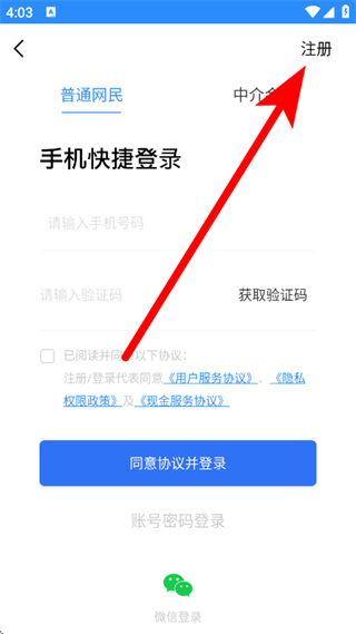 3、在登錄頁面,點(diǎn)擊右上角注冊(cè),進(jìn)入注冊(cè)頁面。