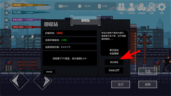 2、進(jìn)入回收站界面后,點(diǎn)擊賣出商品,將收集的廢品變現(xiàn)為金錢,這是積累生存資本的核心途徑,需及時(shí)售賣廢品以維持資源周轉(zhuǎn)。