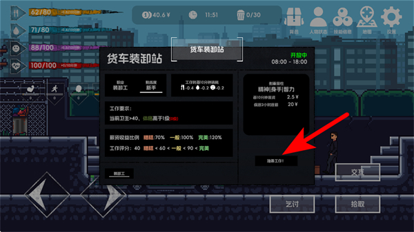 4、進(jìn)入工作界面后,點(diǎn)擊準(zhǔn)備工作如貨車裝卸站的搬運(yùn)工作,通過完成工作獲取穩(wěn)定收入與經(jīng)驗(yàn),這一步是提升生存能力的重要方式。