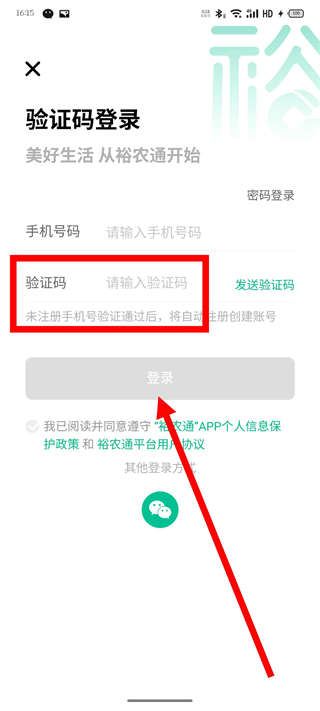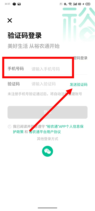 3、在登錄頁面,輸入手機號碼后,點擊發(fā)送驗證碼。