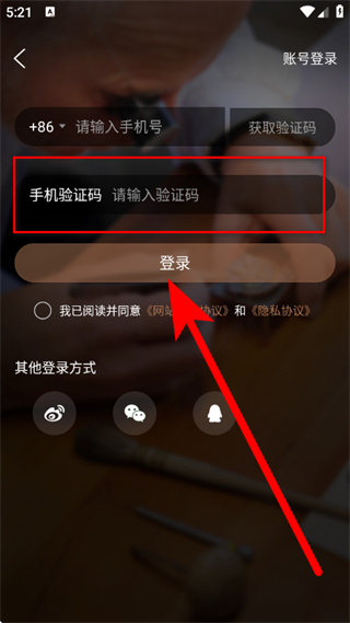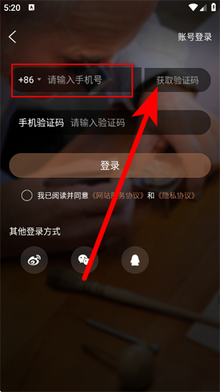 3、在登錄頁面,輸入手機(jī)號碼后,點擊獲取驗證碼。