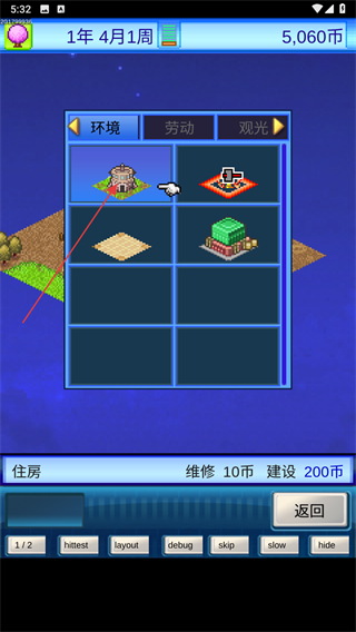 2、在建筑界面內(nèi),點擊環(huán)境找到住房,點擊選擇花費金幣購買建筑。
