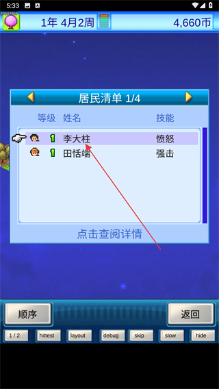 4、點擊島嶼上的居民,可以查看居民的技能等級,點擊信息中的姓名可以查閱詳情。