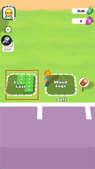 4、到達售賣區(qū)域,將木材放入WoodLogs售賣點,成功獲得Cash金錢,界面清晰顯示現(xiàn)金區(qū)域和木材售賣區(qū)域。