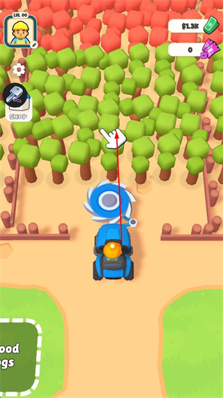 2、駕駛藍色伐木車,按照手指指示前往樹林區(qū)域,開始伐木作業(yè),周圍有紅綠相間的樹木等待砍伐。