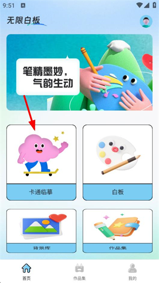 1、在無限白板首頁,點(diǎn)擊卡通臨摹選項(xiàng),可進(jìn)入卡通臨摹頁面。