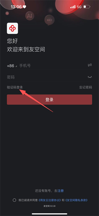 1、在友空間隱私條款的溫馨提示彈窗中,點擊同意,進入登錄界面。
