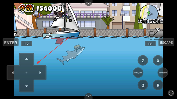 2、通過左下角的虛擬按鍵控制鯊魚的下潛上升或是前后移動。