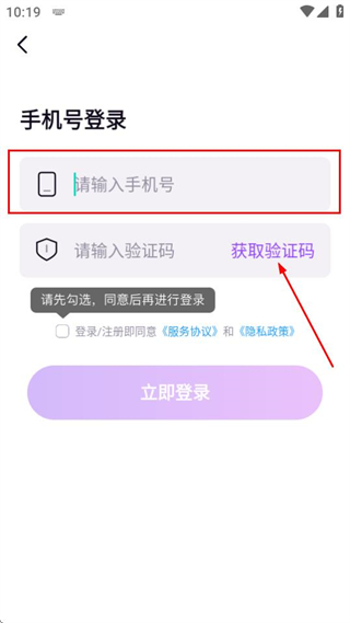 2、在手機(jī)號(hào)登錄頁(yè)面填寫(xiě)手機(jī)號(hào),勾選協(xié)議后,點(diǎn)擊獲取驗(yàn)證碼。