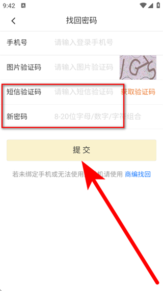 3、輸入短信驗證碼、新密碼后,點擊提交,完成密碼重置。