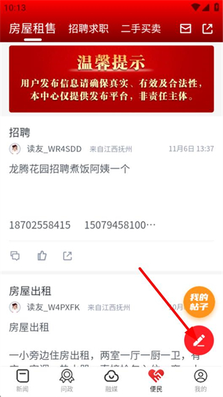 2、進(jìn)入便民服務(wù)頁面后,點(diǎn)擊發(fā)帖圖標(biāo),若未登錄觸發(fā)登錄頁面。