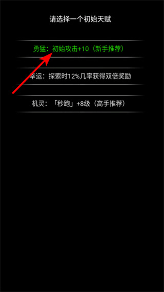 1、進(jìn)入游戲后,選擇勇猛初始攻擊+10天賦,這是提升初始戰(zhàn)力的關(guān)鍵選擇,新手選擇更輕松開展冒險(xiǎn)。